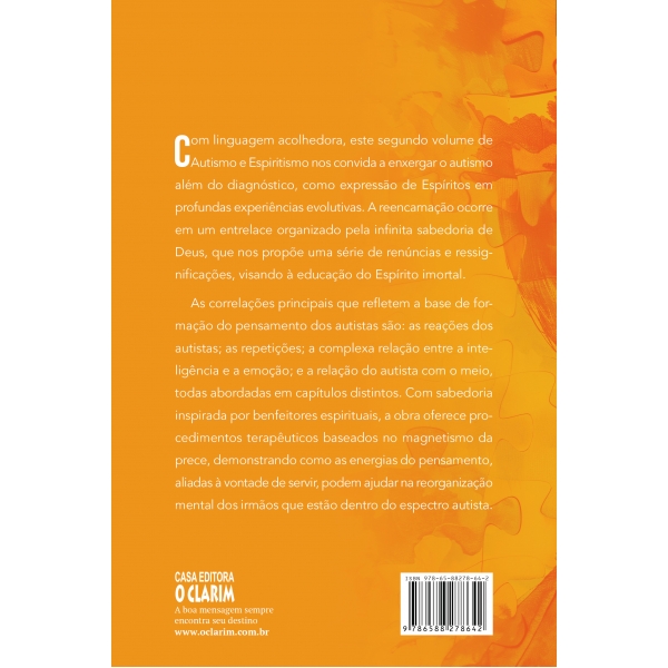 Com linguagem acolhedora, este segundo volume de Autismo e Espiritismo nos convida a enxergar o autismo além do diagnóstico, como expressão de Espíritos em profundas experiências evolutivas. A reencarnação ocorre em um entrelace organizado pela infinita sabedoria de Deus, que nos propõe uma série de renúncias e ressignificações, visando à educação do Espírito imortal.
