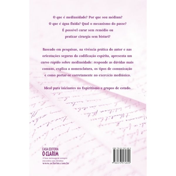 Baseado em pesquisas, na vivência prática do autor e nas orientações seguras da codificação espírita, apresenta um curso rápido sobre mediunidade: responde as dúvidas mais comuns, explica a nomenclatura, os tipos de comunicação e como portar-se corretamente no exercício mediúnico.